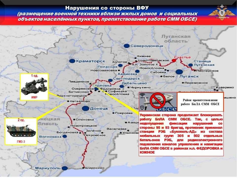 Так, с целью недопущения фиксации нарушений со стороны 95-й и 93-й бригад, противник применял станции РЭБ «Буковель-АД» из состава мобильных групп 305-го и 502-го отдельных батальонов РЭБ для радиоэлектронного подавления каналов управления и навигации БПЛА СММ ОБСЕ в районах н. п. Федоровка и Южное.