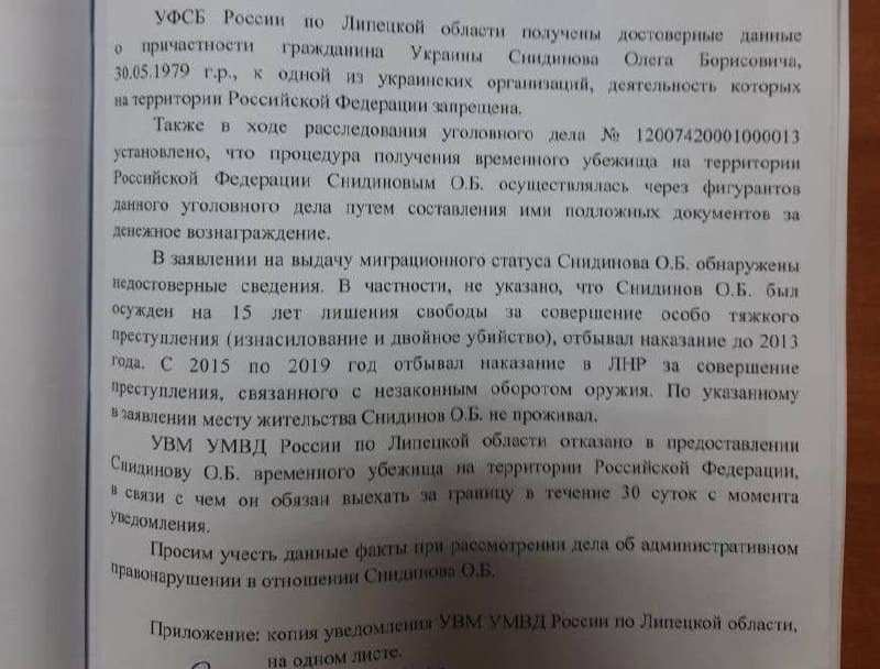 За совершенные ранее тяжкие преступления гражданину было отказано в получении статуса беженца, и Октябрьский районный суд г. Липецка приговорил Снидинова О.Б. к выдворению на территорию ЛНР.