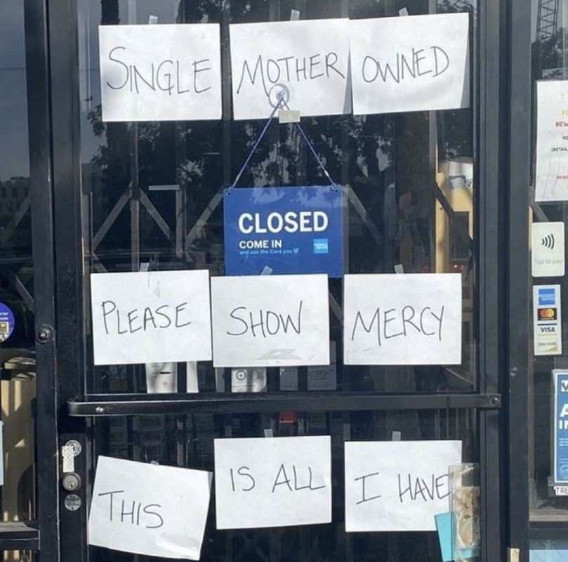 Надписи на входе в закрытый магазин на скрине: „Владелец — мать-одиночка“, „Пожалуйста, проявите милосердие“, „Это всё, что у меня есть“.