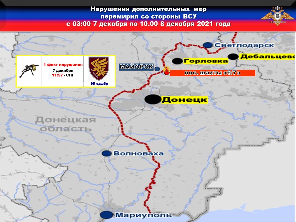 Согласно официальному отчету Миссии ОБСЕ от 7 декабря 2021 года, отмечаются факты открытия огня с позиций 25-й овдбр в районе ДФС и с позиций 93-й бригады в пределах участка разведения сил и средств в районе н. п. Петровское.
