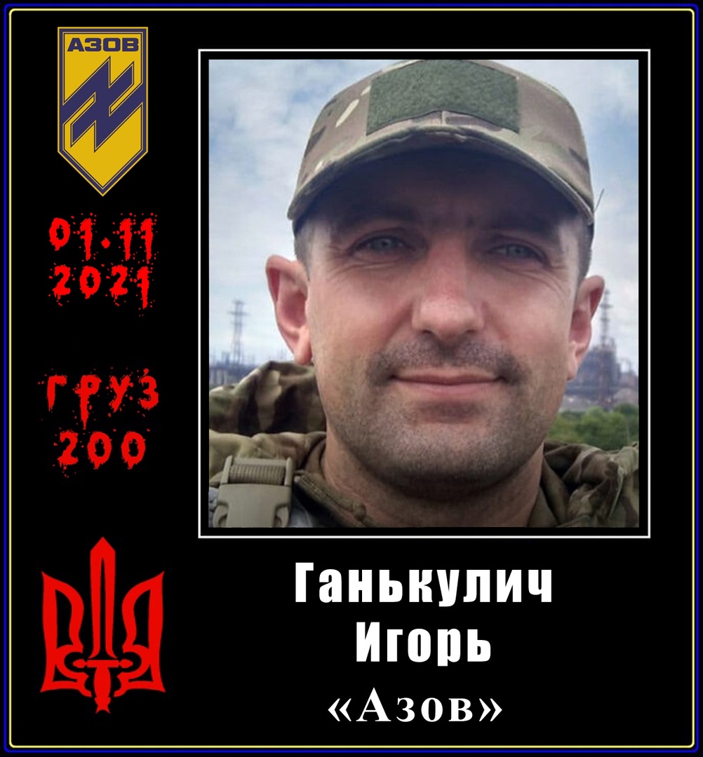 ► 01.11.2021 — Ганькулич Игорь Иванович, 1982 г. р., военнослужащий 1-го батальона Отдельного полка «Азов». С 2014 года добровольно отправился в зону «АТО»/«ООС», где за деньги истреблял мирное население Донбасса.