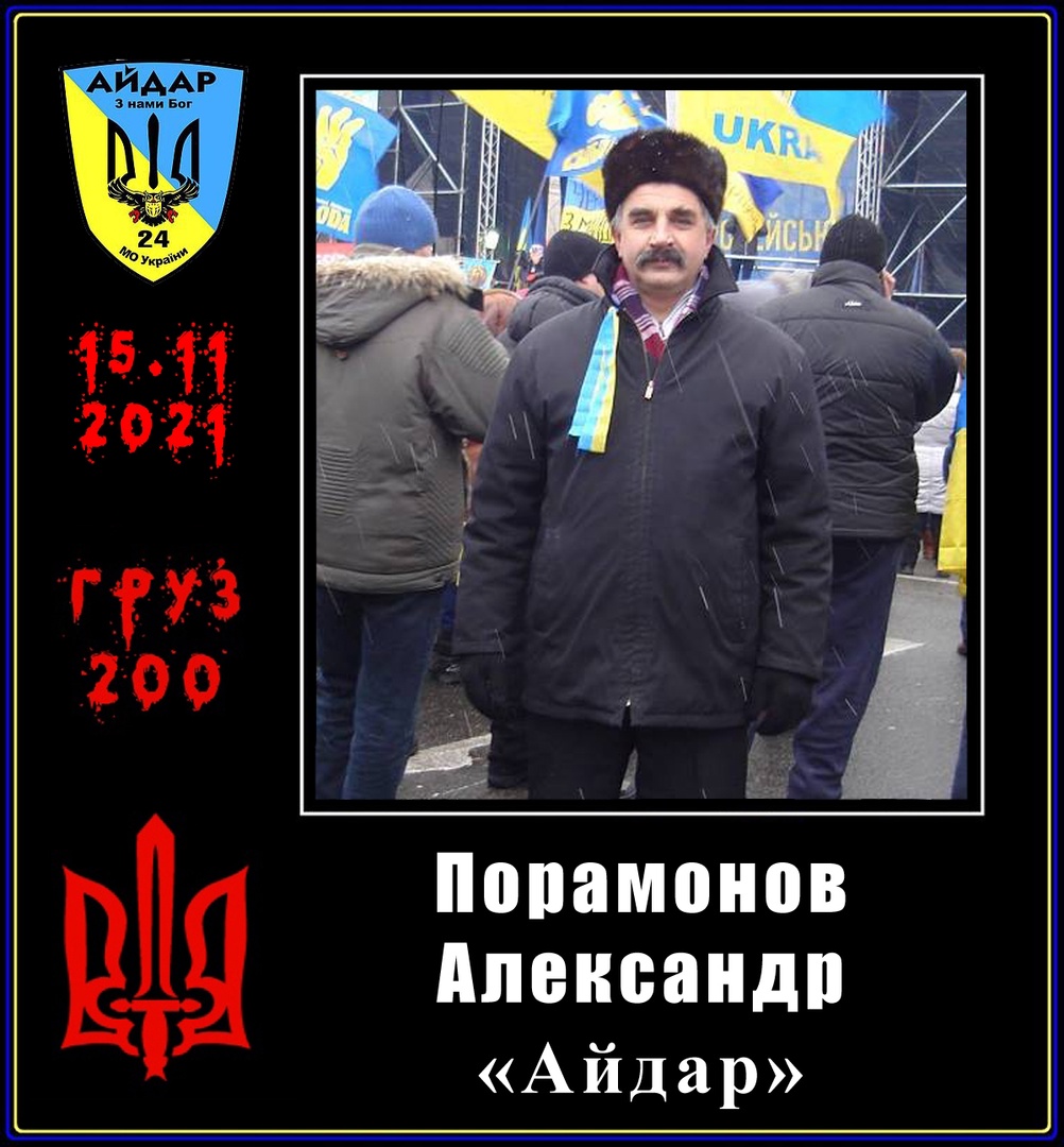► 15.11.2021 — Порамонов Александр, 1963 г. р., военнослужащий формирования «Айдар». Свою расплату за жизни невинно убиенных мирных жителей Донбасса получил в виде внезапной смерти. На родине «героя и защитника незалежной» в г. Старобельске, временно оккупированная территория ЛНР, остались жена и дети.