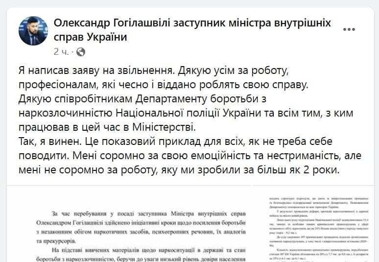 Мне стыдно за свою эмоциональность и несдержанность, но мне не стыдно за работу, которую мы проделали более чем за два года», — написал Гогилашвили, опубликовав скан неизвестного документа, в котором перечисляются его достижения в сфере борьбы с наркопреступностью.