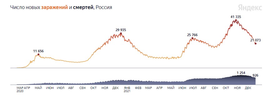 За всё время с начала эпидемии в России выявлено 10 479 344 случая заражения коронавирусом. Полностью излечились 9 423 227 человек, 43 004 из них — за минувшие сутки.