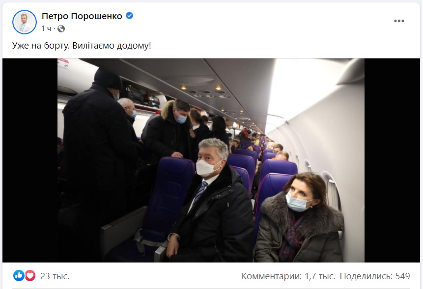 Самолёт, на котором Порошенко вернулся на Украину, только что приземлился в аэропорту «Киев» (бывшие «Жуляны»). Ранее он опубликовал на своей странице в соцсети фотографию, сделанную на борту, и сообщил, что «вылетает домой».