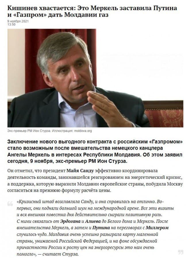 К примеру, бывший премьер страны Ион Стурза тогда нахваливал президента Майю Санду и заявлял, что новый выгодный контракт с «Газпромом» был заключён после вмешательства уходящего канцлера Германии Ангелы Меркель.