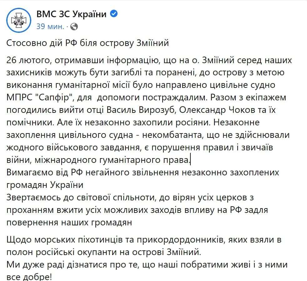 26 февраля, получив информацию, что на о-ве Змеиный среди наших защитников могут быть погибшие и раненые, на остров с целью выполнения гуманитарной миссии было направлено гражданское судно МПРС „Сапфир“ для помощи пострадавшим.