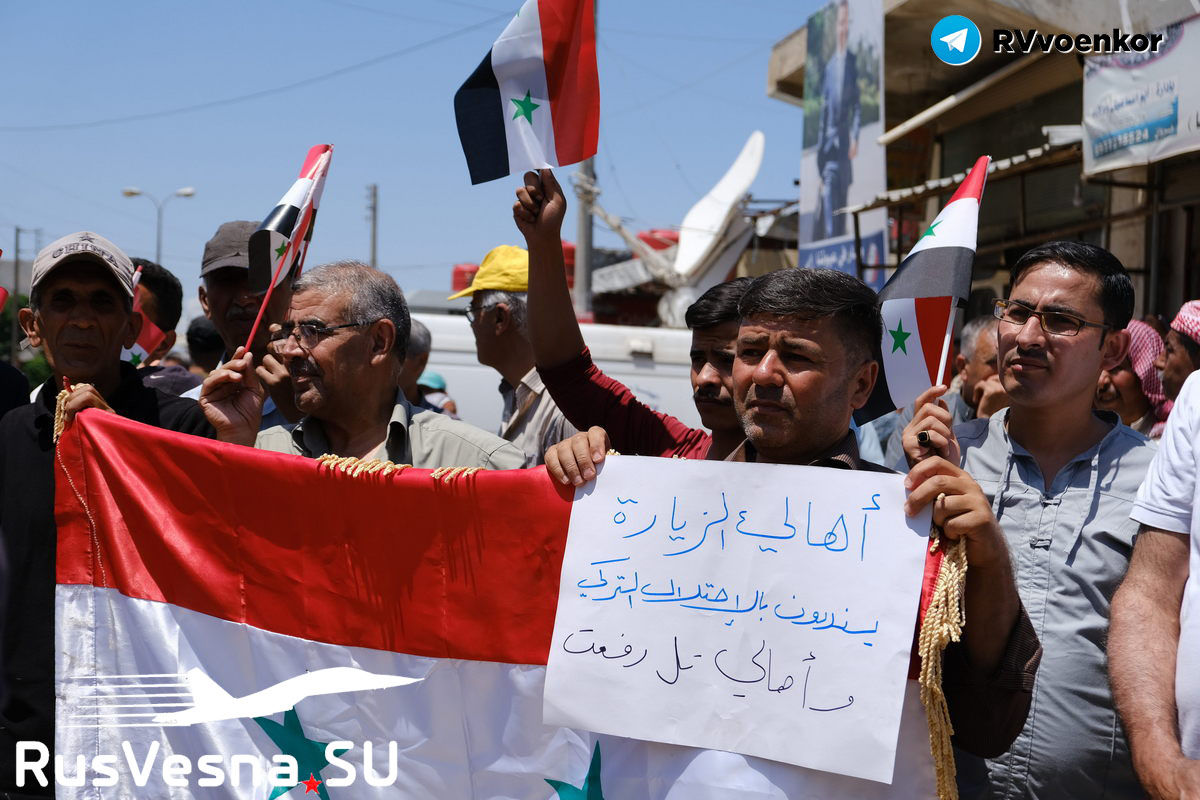 В населённом пункте Телль-Рифьят на севере Сирии прошла акция протеста местного населения против расширения зоны деискалации Турцией на 30 км.