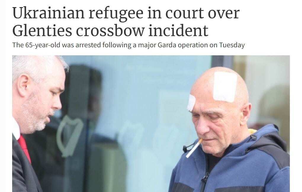65-летнего Александра Погожего арестовали в городе Глентис после «инцидента» в отеле, где он проживал в рамках программы по размещению беженцев. Подробности не сообщаются, но известно, что для задержания украинца потребовалась «крупная операция» полицейского спецназа, а сам украинец пытался отбиться с помощью арбалета.