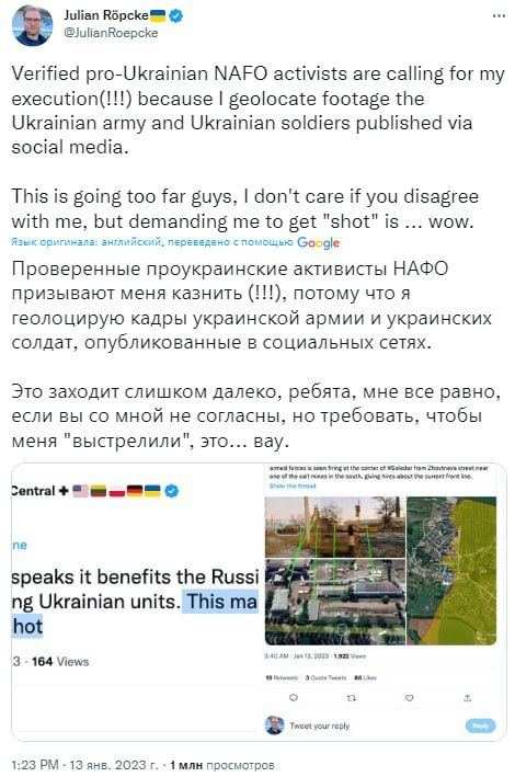 Об этом он сам рассказал в Twitter, объяснив, что украинцы в буквальном смысле хотят, чтобы его застрелили из-за выложенных им данных о месте расположения боевиков ВСУ в Соледаре. Он подчёркивает, что эти данные ранее выкладывали в Сеть сами украинские террористы.