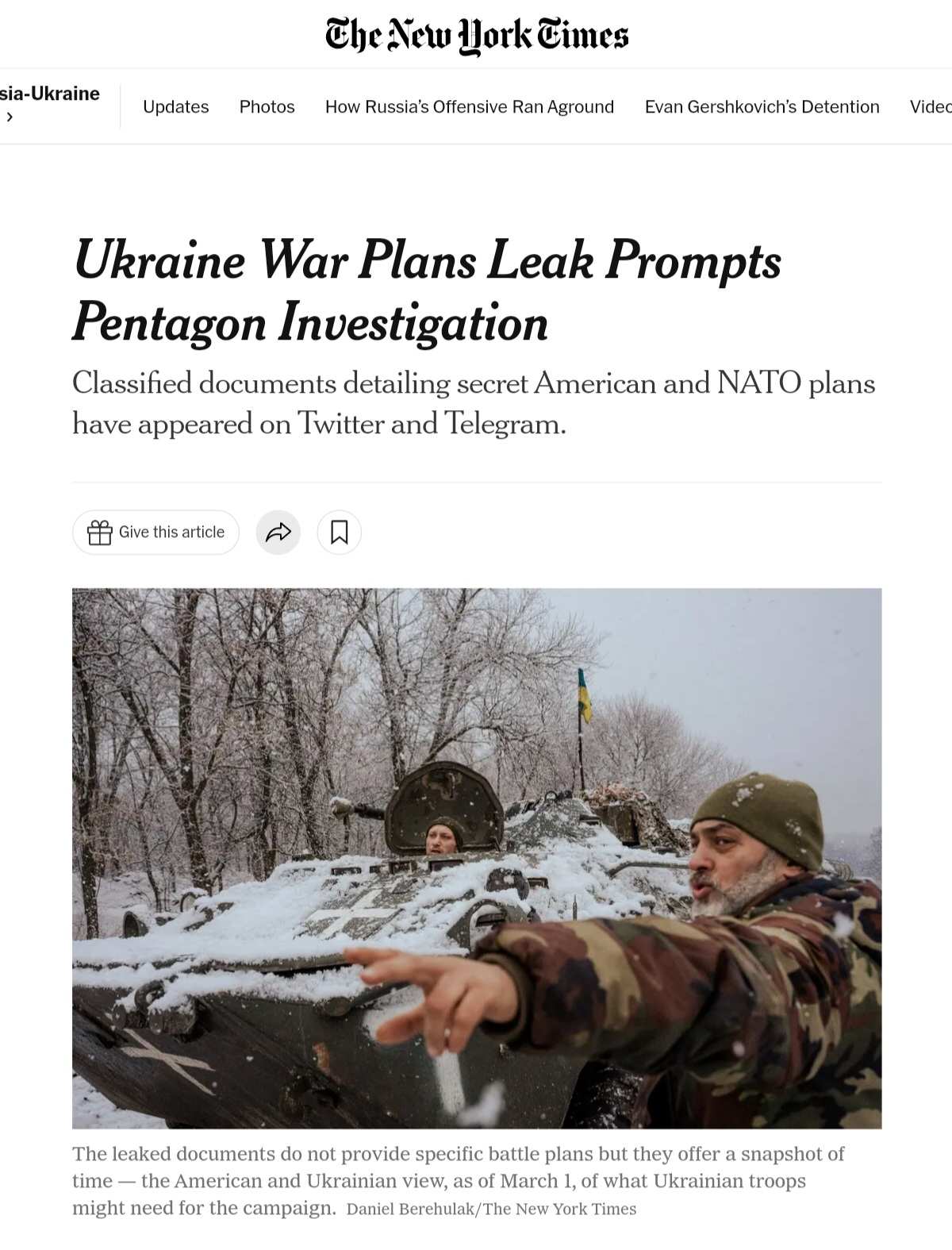 «Засекреченные военные документы, в которых подробно излагаются планы США и НАТО по наращиванию вооруженных сил Украины в преддверии запланированного наступления на Россию, были опубликованы на этой неделе в соцсетях», — пишет американское издание The New York Times, уточняя, что Пентагон инициирует собственное расследование.