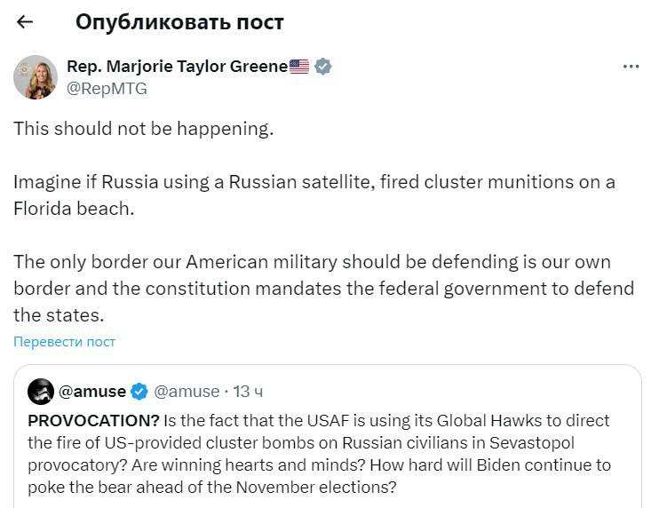 «Такого не должно происходить», — заявила конгрессвумен США Марджори Тейлор Грин, комментируя вчерашний удар американскими ракетами ATACMS по пляжу Севастополя.