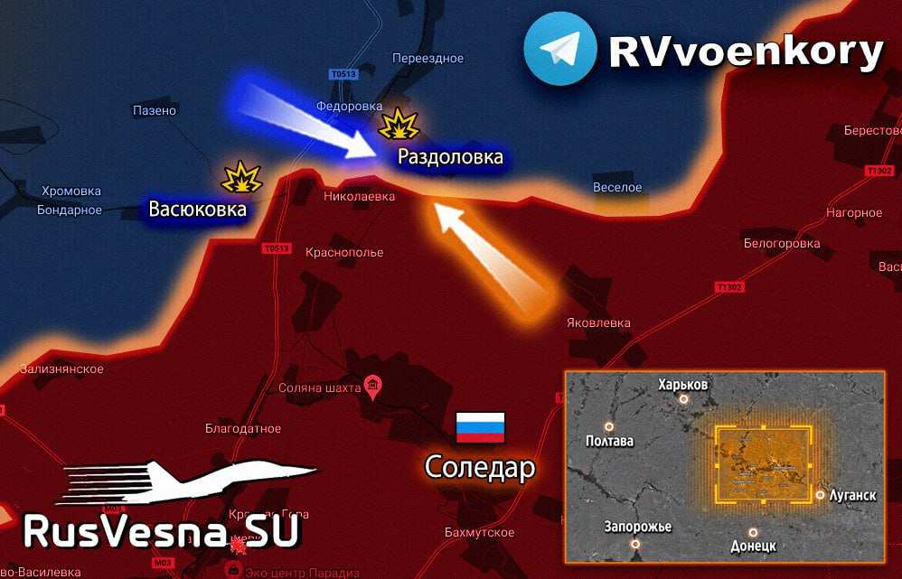 ВСУ атакуют вдоль канала «Северский Донец-Донбасс», им удалось с боями продвинуться по посадкам. Украинские войска пытаются расширить плацдарм к востоку от канала.