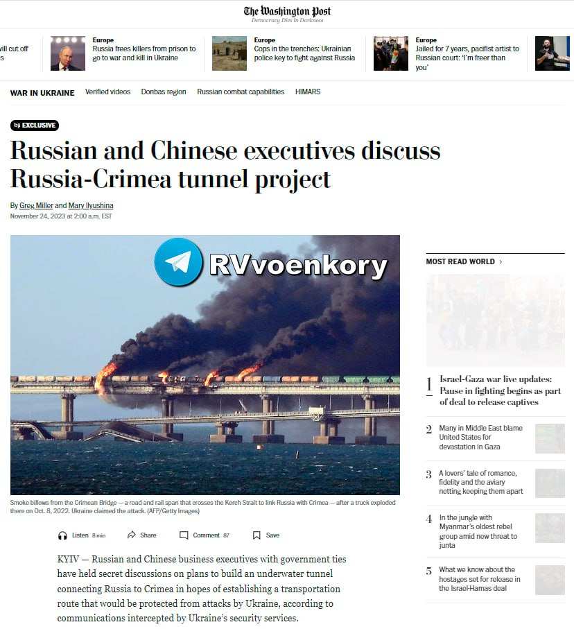 Издание, ссылаясь на сообщения, якобы перехваченные украинскими спецслужбами, утверждает, что российские и китайские бизнесмены провели секретные обсуждения планов строительства подводного туннеля, соединяющего Россию с Крымом, в надежде создать транспортный маршрут, который будет защищен от нападений со стороны Украины.