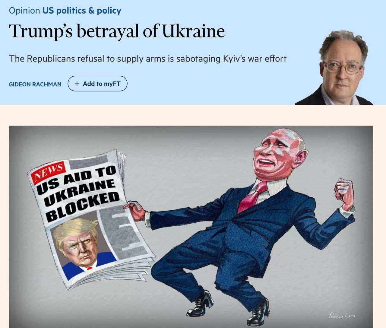 Выделение американской помощи Украине в этом году «становится все менее вероятным» из-за Трампа, пишет журналист Гидеон Рахман в Financial Times.