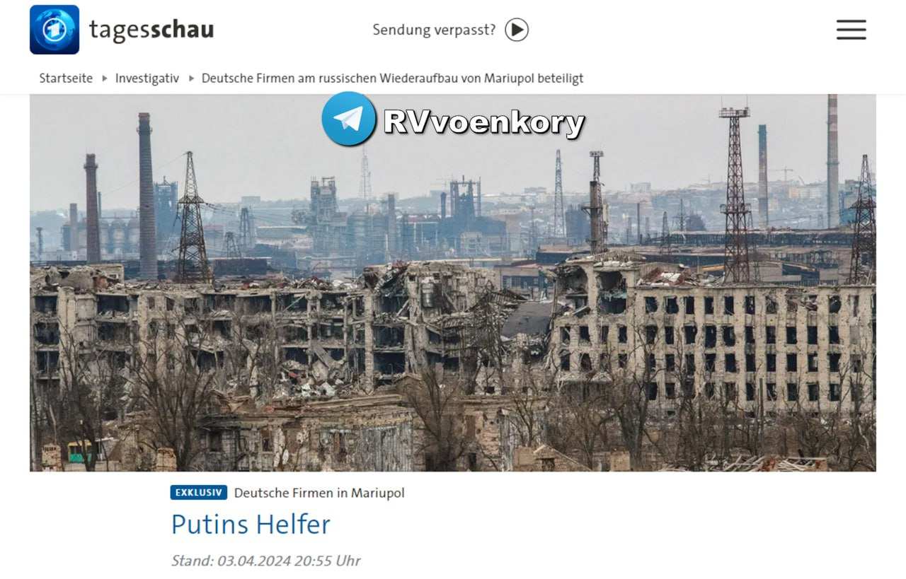 В материале, который называется «Помощники Путина», говорится о том, что в годовых отчетах ряда немецких компаний, на их сайтах, на фотографиях и видео — повсюду есть свидетельства и доказательства того, что эти фирмы играют важную роль в восстановлении Мариуполя.