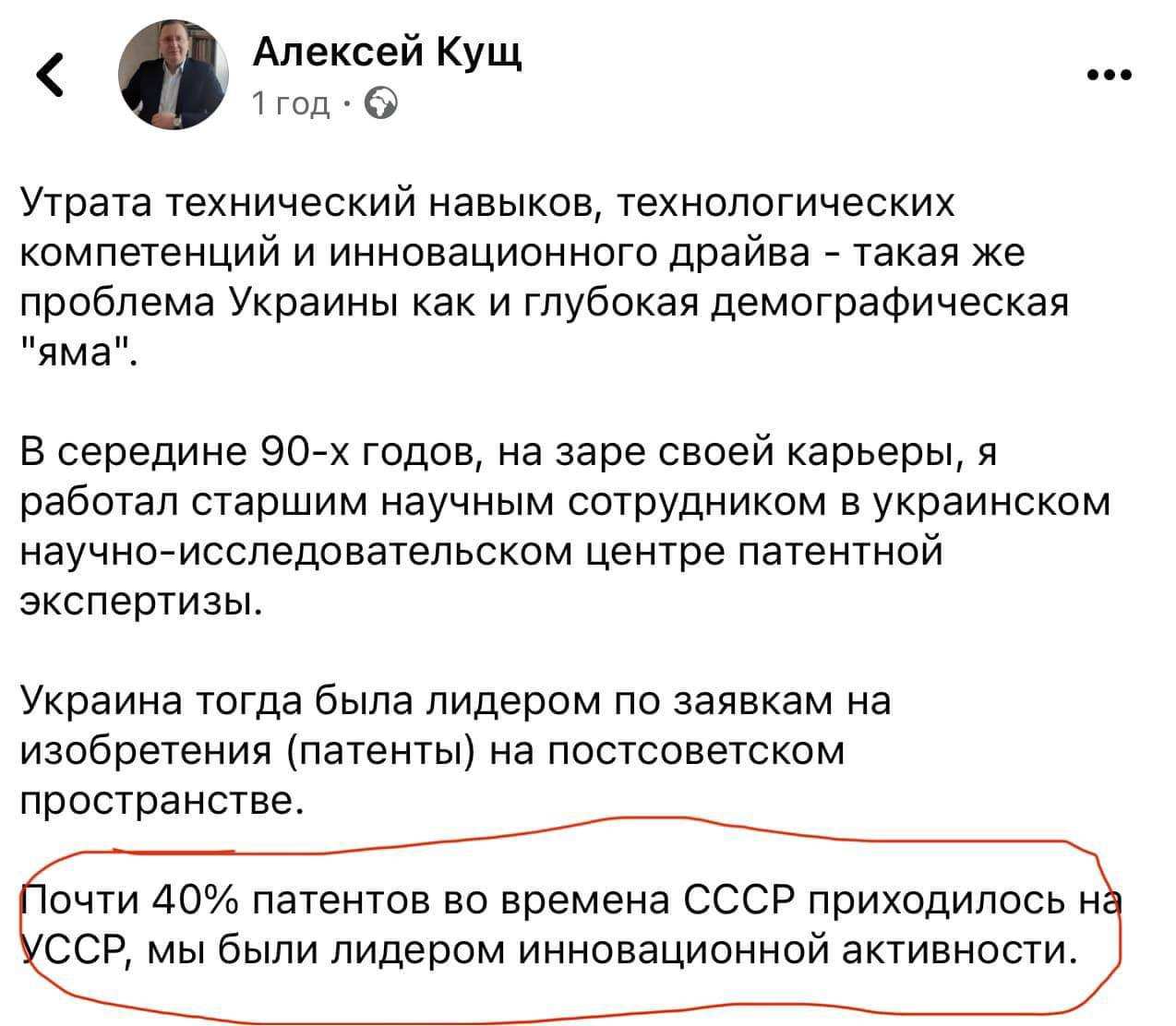 Именно так он прокомментировал публикацию в соцсети киевского экономиста Алексея Куща, который внезапно затосковал по советским временам, когда «красные оккупанты» изо всех сил навязывали Украине наукоёмкое производство.