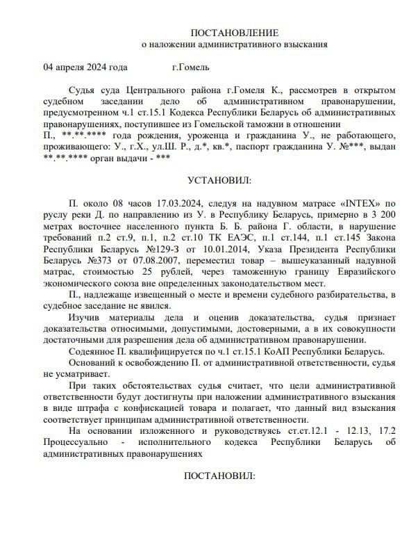 Согласно решению суда, украинец должен уплатить штраф в 400 белорусских рублей (около 5 тысяч грн), а матрас, стоимость которого оценили в 25 рублей (около 300 грн), подлежит конфискации. О дальнейшей судьбе гражданина Украины ничего не сообщается.