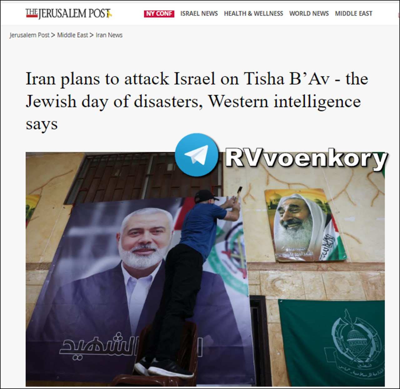 Западные разведывательные источники сообщили Sky News Arabia, что Иран планирует атаку на Израиль на Тиша Б’Ав (12-13 августа) в ответ на убийство лидера ХАМАС Исмаила Ханийи.