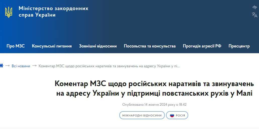 МИД Украины в специальном заявлении «решительно отверг» такие заявления, а также «все обвинения, периодически звучащие из уст чиновников Мали и Нигера, в якобы причастности Украины к „сотрудничеству с террористами“, „поставке террористам вооружения и предоставления им информации“, „поддержке Украиной террористической коалиции“ и тому подобное».