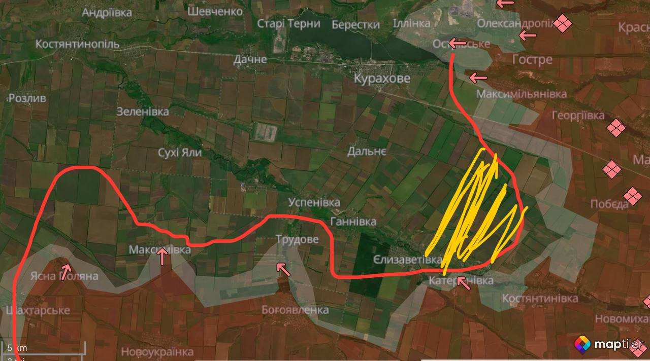 ВСУ пытаются контратаковать и разблокировать подразделения севернее линии Победа — Константиновка (желтым выделена серая зона). Судя по местности, ВСУ там закрепиться не смогут.