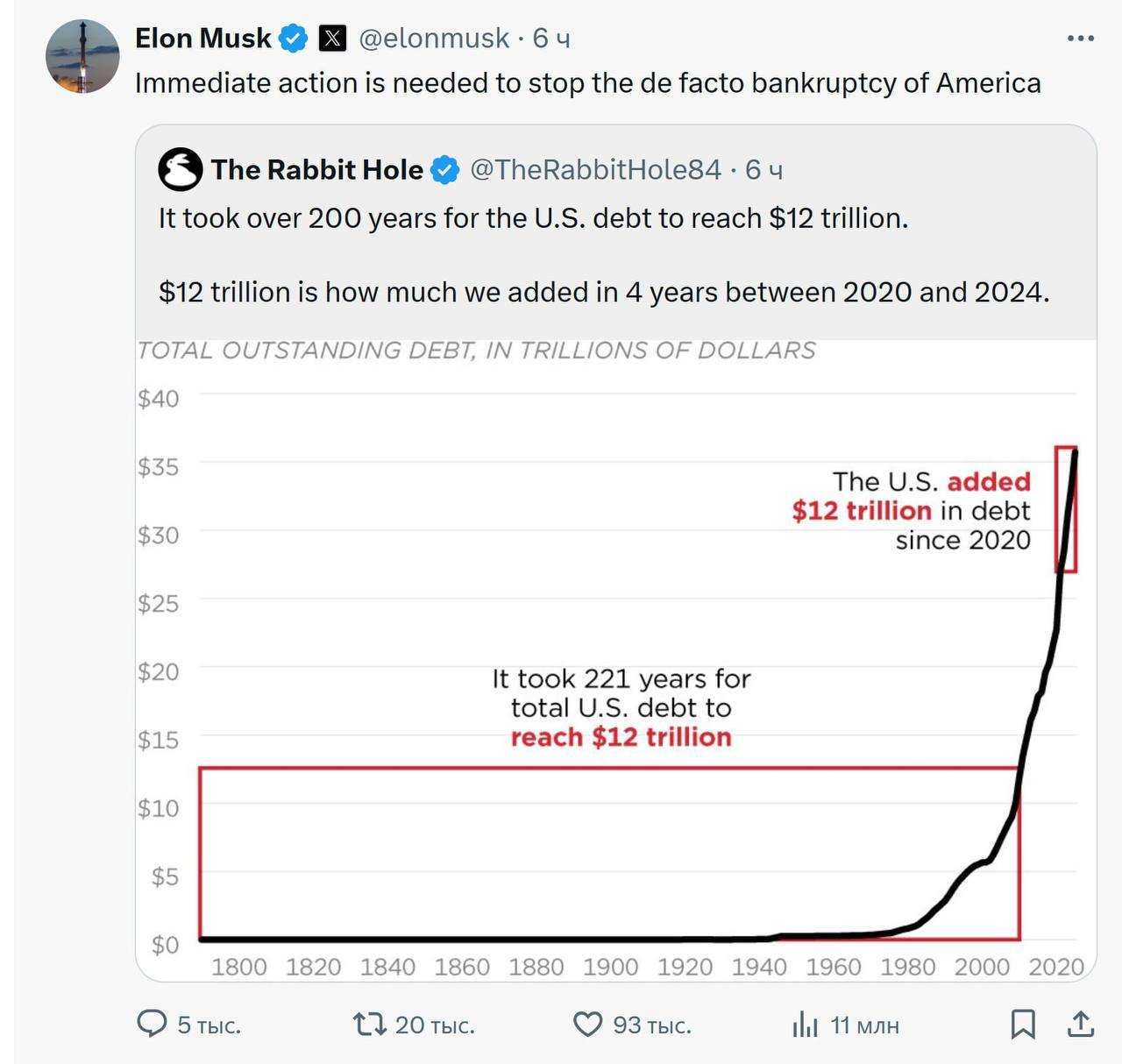 «Необходимы немедленные действия, чтобы остановить фактическое банкротство Америки», — написал предприниматель, комментируя новость о том, что госдолг США в 2020–2024 гг. вырос на 12 трлн долларов.