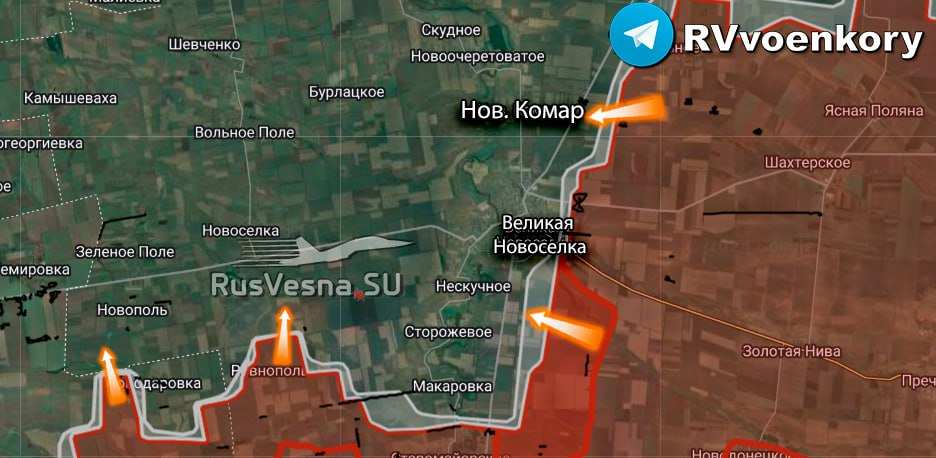 Украинские военно-аналитические ресурсы сообщают, что российские войска прорвались в населенный пункт Новый Комар, к северу от Великой Новоселки (ДНР).