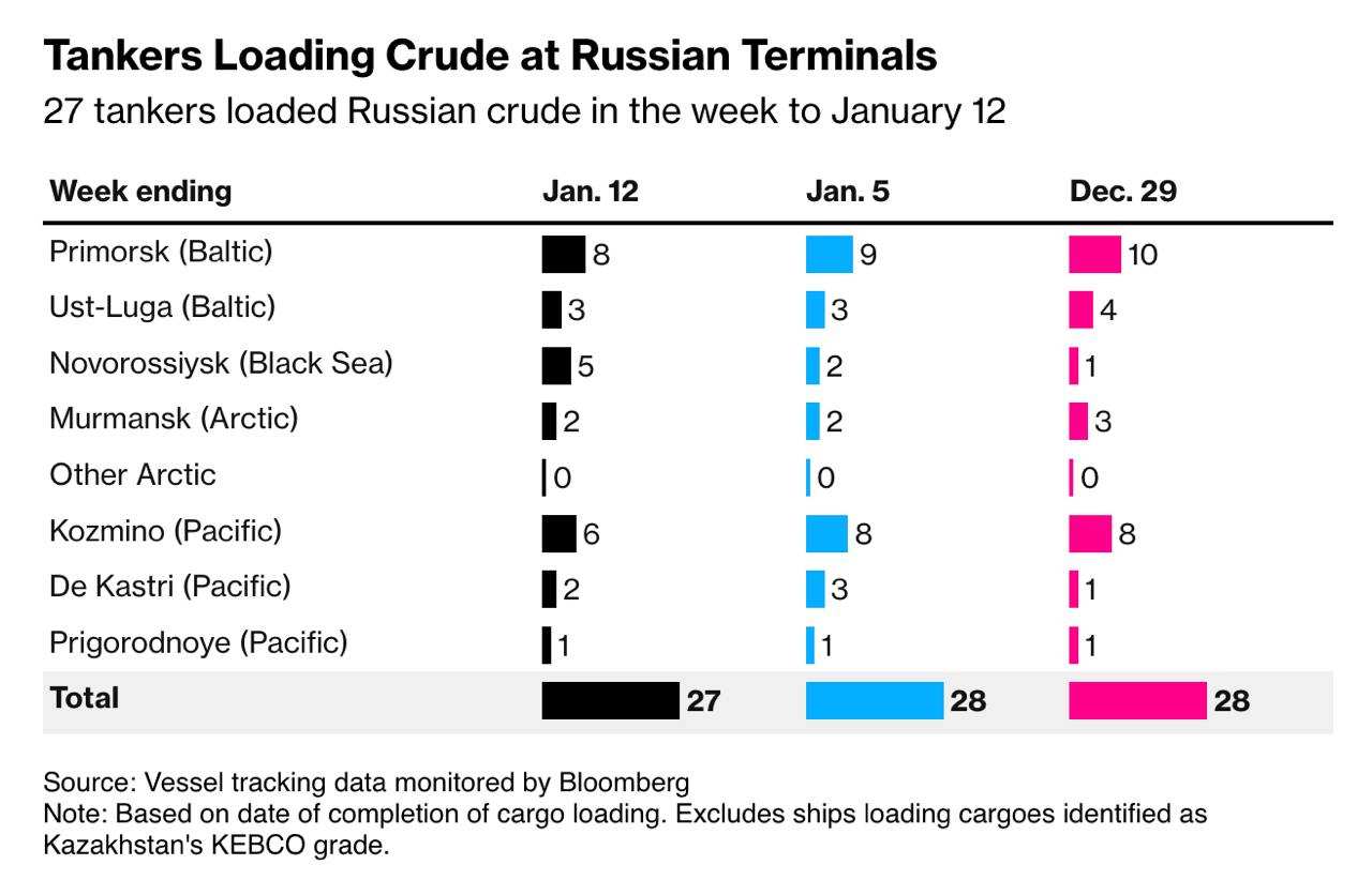 Санкции был введены 10 января. За неделю с 6 по 12 января 27 танкеров погрузили 21,06 млн баррелей российской сырой нефти. Неделей ранее было 21,18 млн баррелей на 28 судах.