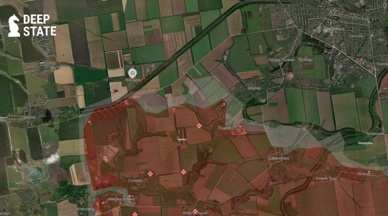 В последние несколько дней ВС РФ имели успех в районе села Котлино к западу от Покровска (Красноармейска), сообщает украинский военно-аналитический ресурс Deep State:
