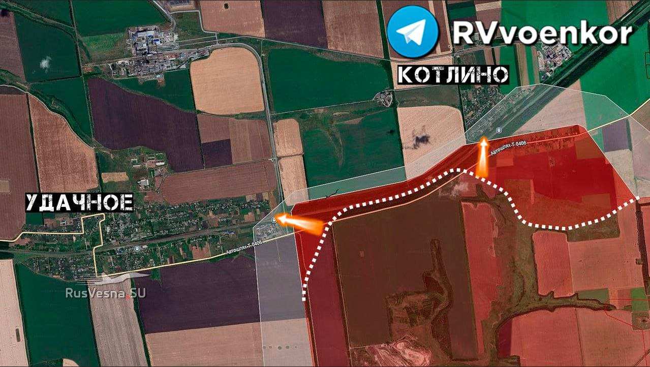 «Враг совершил штурм на Лисовку… Очень активно наступают на Котлино, бои проходят в центре села и восточнее, наши казаки сейчас в плохом положении. Также русские штурмуют Удачное и уже смогли закрепиться на окраинах, дополнительно стремятся пробить путь к железнодорожной станции. Если ВС РФ возьмут контроль над станцией, то силами ВСУ придется отходить в район шахты, которая является важным узлом обороны».