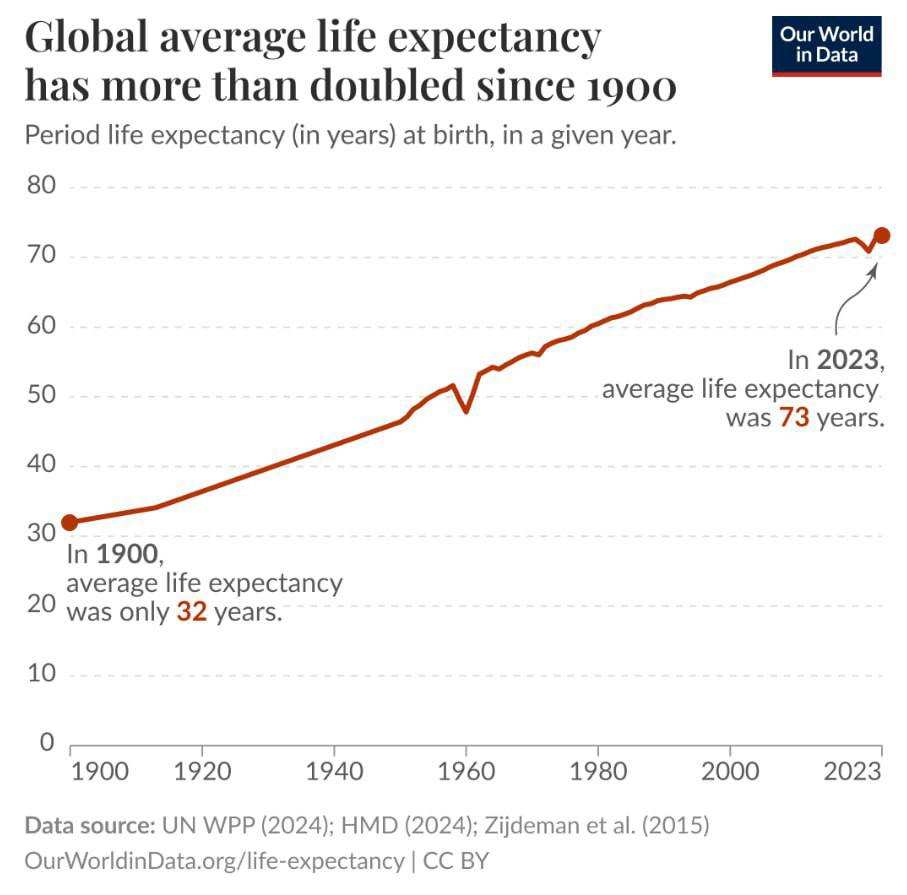 Средняя продолжительность жизни в мире увеличилась более чем в два раза с 1900 года. В 2023 году она составила 73 года, в то время как в начале прошлого века было всего 32 года.
