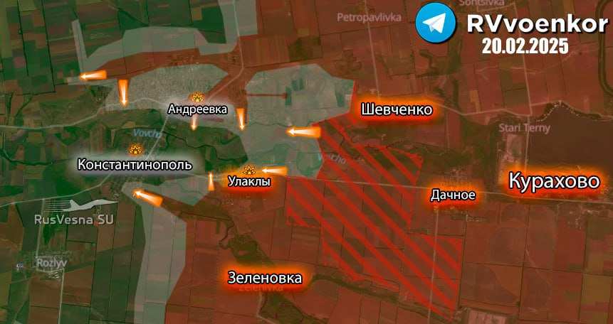 На константинопольском направлении русские заняли «Кураховский карман» и продолжают давить в районе н. п. Улаклы и Константинополь. Часть российских штурмовых групп перебрасывается в район соседней Андреевки (покровское направление), которую также активно зачищают от сил ВСУ.