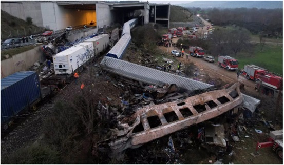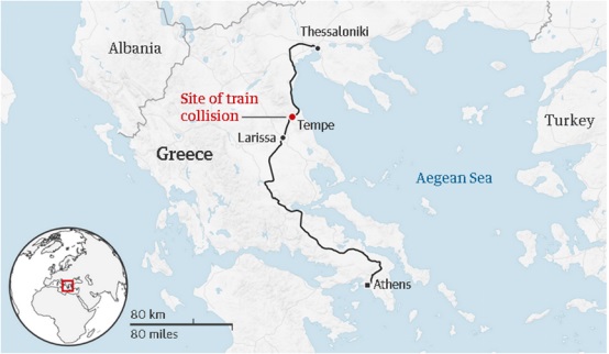 В частности, пассажирский поезд компании Hellenic Train, входящей в итальянскую государственную компанию Ferrovie Dello Stato Italiane, направлявшийся из Афин в Салоники и перевозивший более 350 пассажиров, столкнулся лоб в лоб ночью в 23:21 с коммерческим поездом той же компании, направлявшимся из Салоников в Триасио Педио, равнину в префектуре Аттика, к западу от Афин.