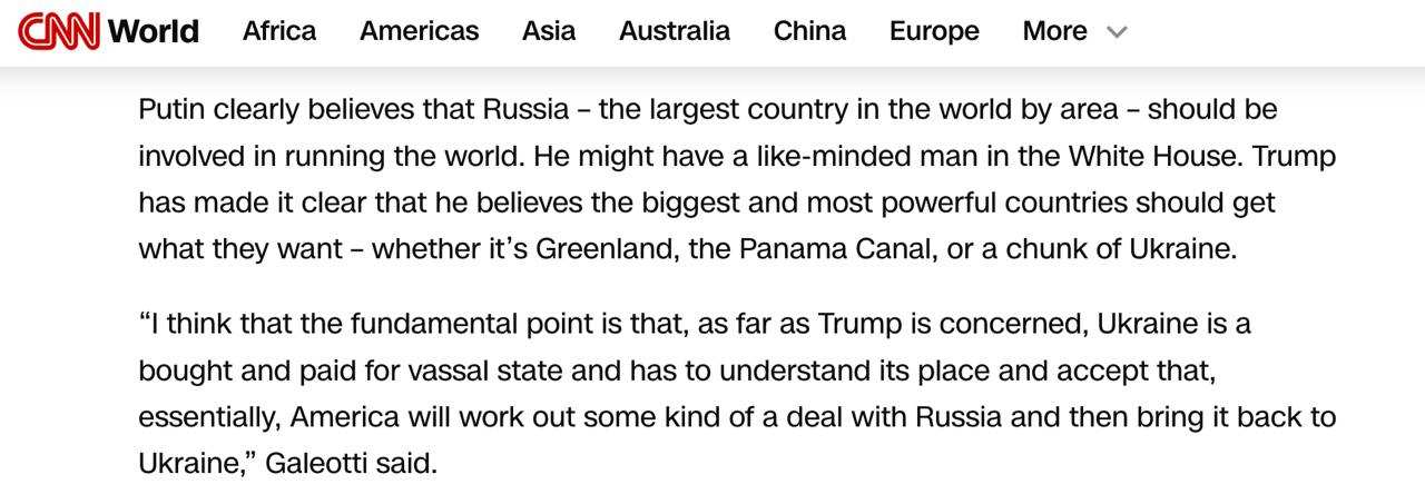 «Я думаю, что принципиальный момент заключается в том, что с точки зрения Трампа Украина является купленным и оплаченным вассальным государством и должна понимать свое место и принять, что, по сути, Америка выработает какую-то сделку с Россией, а затем преподнесет ее Украине», — отметил Галеотти.