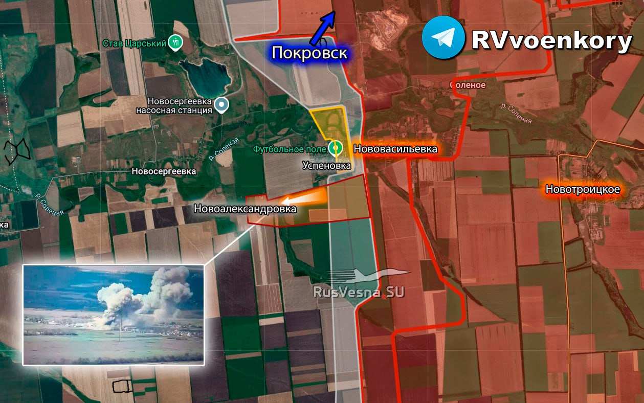 Российские войска выбили контратаковавшие силы ВСУ из Успеновки к северо-западу от Покровска и прорвались в Новоалександровку, штурмуя посёлок.