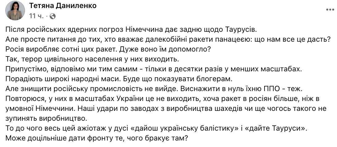 «Даже если их начнут поставлять, они не смогут уничтожить российскую промышленность или истощить ПВО», — жалуется она.