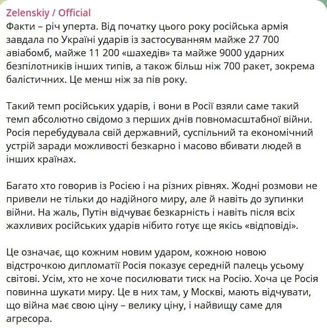 К сожалению, Путин чувствует безнаказанность и даже после всех ужасающих российских ударов якобы готовит еще какие-то ответы», — ноет Зеленский.