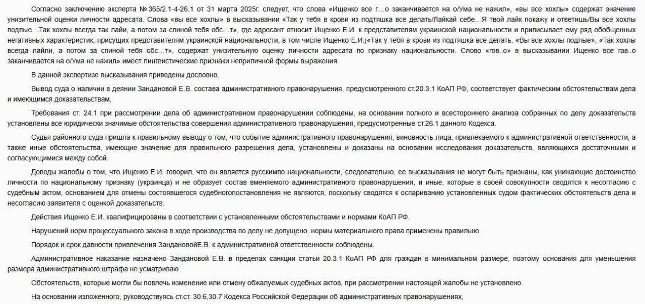 Экспертиза пришла к выводу, что в этих фразах содержится «унизительная оценка личности адресата по признаку национальности», а также они «приписывают ему ряд обобщённых негативных характеристик, присущих представителям украинской национальности».