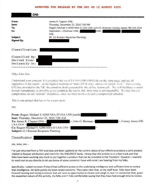 «Недавно рассекреченные секретные электронные письма раскрывают, как директор национальной разведки Джеймс Клэппер требовал от разведывательного сообщества поддержать миф о России. Клаппер признает, что это была “командная работа”», — написала Габбард и опубликовала эти документы.