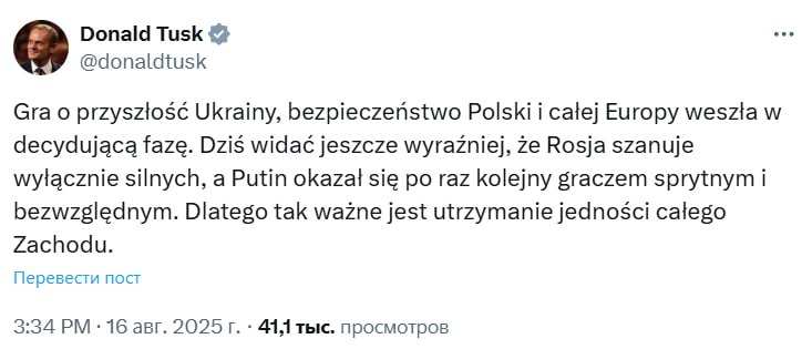 После встречи президентов России и США Владимира Путина и Дональда Трампа «игра за будущее» Украины, Польши и всей Европы вошла в решающую фазу, заявил польский премьер-министр Дональд Туск.