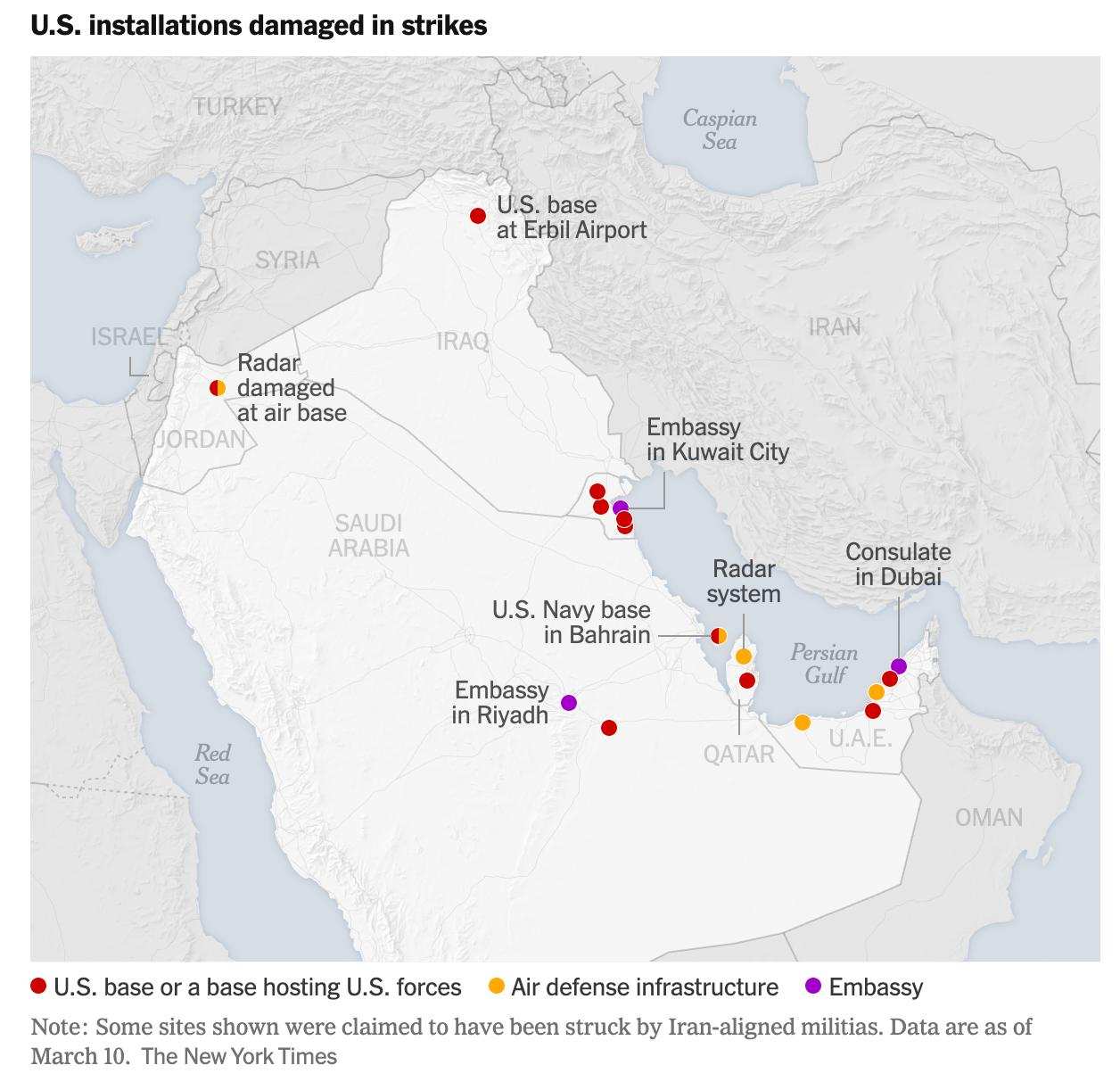 Иран выпустил уже тысячи ракет и беспилотников по военным объектам США и стран-союзников в регионе. По словам американских официальных лиц, удалось перехватить большинство из них, но по меньшей мере 11 американских военных баз или объектов получили повреждения — это почти половина всех подобных объектов в регионе.