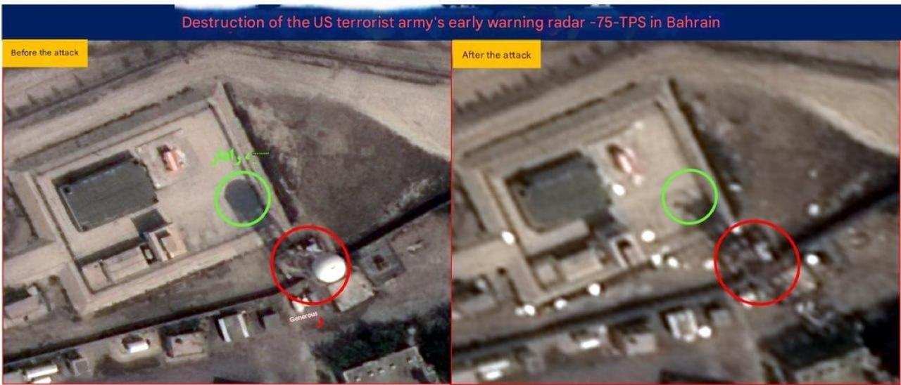КСИР публикует спутниковые снимки поражения ключевых американских РЛС в Бахрейне.