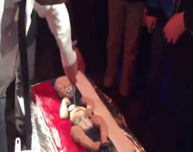 Ведущий объявил: «И вот, как мы и обещали, сейчас будем есть русского-говорящего младенца! Съедим его духовно-православно!», после чего к сцене вынесли торт в цвет российского флага, на котором лежал кремовый грудничок.