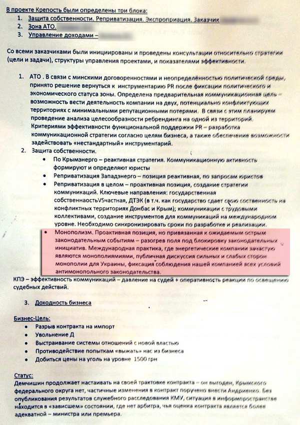 В случае, если менеджмент компании ДТЭК будет отрицать существование подобного документа, готов предоставить и опубликовать перечень всех лиц, ответственных за реализацию проекта «Крепость», а также более детальный план мероприятий, часть которых уже реализована. Помимо этого в ближайшее время я передам детальный план «Крепости» общественным организациям для анализа и подготовки ответных шагов.