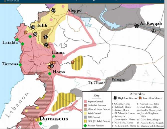 Основная часть ударов пришлась по району между Хомсом и Хамой, где сирийская армия сейчас готовит наступление, а также по провинции Идлиб, где-де-факто ослабляется военный потенциал мятежников, которые угрожали положению Латакии и мешали стабилизации фронта сирийской армии. Попутно был нанесен визит вежливости столице Халифата Ракке. Задействованы были Су-24, Су-25 и Су-34. Источники на Западе утверждают, что купол ПВО, который развернут на северо-западе Сирии у побережья, серьезно затрудняет воздушные операции проамериканской коалиции, и именно поэтому США вынуждены консультироваться с Россией, потому что игнорирование новой реальности может оказаться чреватым.