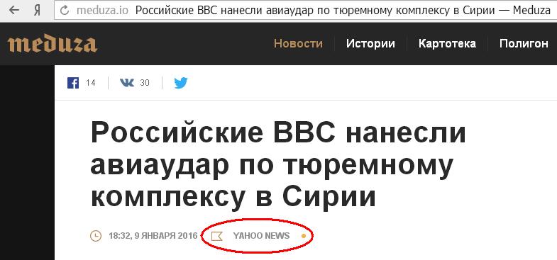Причем сотрудники «Медузы» не слишком утруждают себя поисками первоисточников компрометирующих действия российских военных материалов и ссылаются прямо на новостной агрегатор поисковой системы «Yahoo».