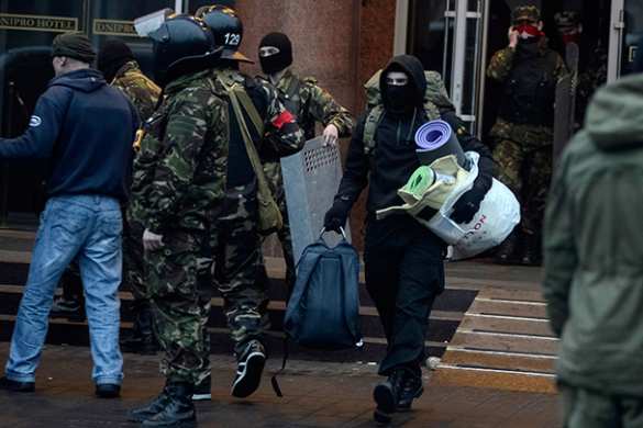 Также памятно первое «выселение» ПС из «Днепра» в апреле 2014 года: тогда боевиков в масках, выносивших сумки с оружием и кофры со снайперскими винтовками, сопровождал на тот момент секретарь Совета безопасности, а ныне вице-спикер Верховной рады, Андрей Парубий.