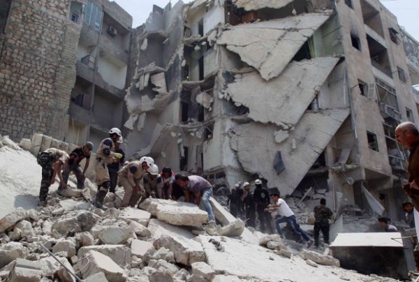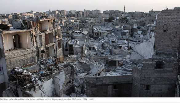Photo was originally published at British ibtimes.co.uk 17 Nov. 2014. Caption reads: «Buildings reuces to rubble in the Kalasa neighbourhood of Aleppo, 28 Oct. 2014».