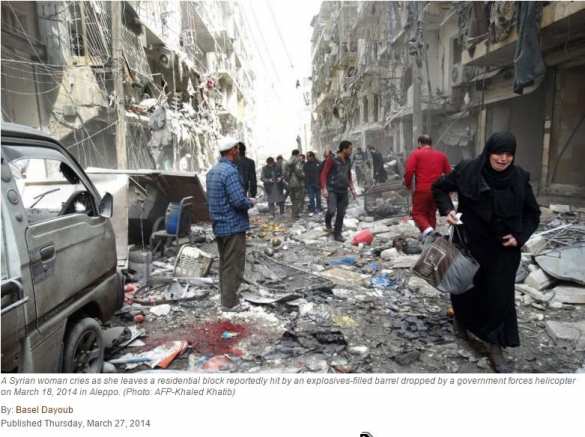 The photo was initially published at al-akhbar.com 27 March 2014. Caption reads: «A Syrian woman cries as she leaves residential block reportedly hit by an explosives-filled barrel dropped by a government forces helicopter 18 March 2014».