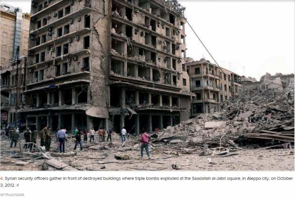Photo was first published at theatlantic.com 4 Oct. 2012. Caption reads: «Syrian officials gather among the destroyed buildings after series of explosions on Saadalla al-Jabri in Aleppo, 3 Oct. 2012».